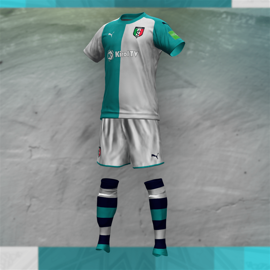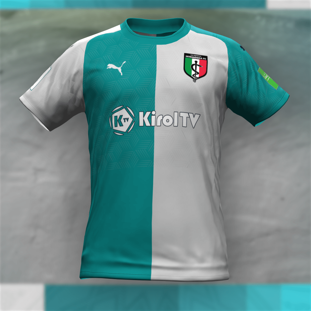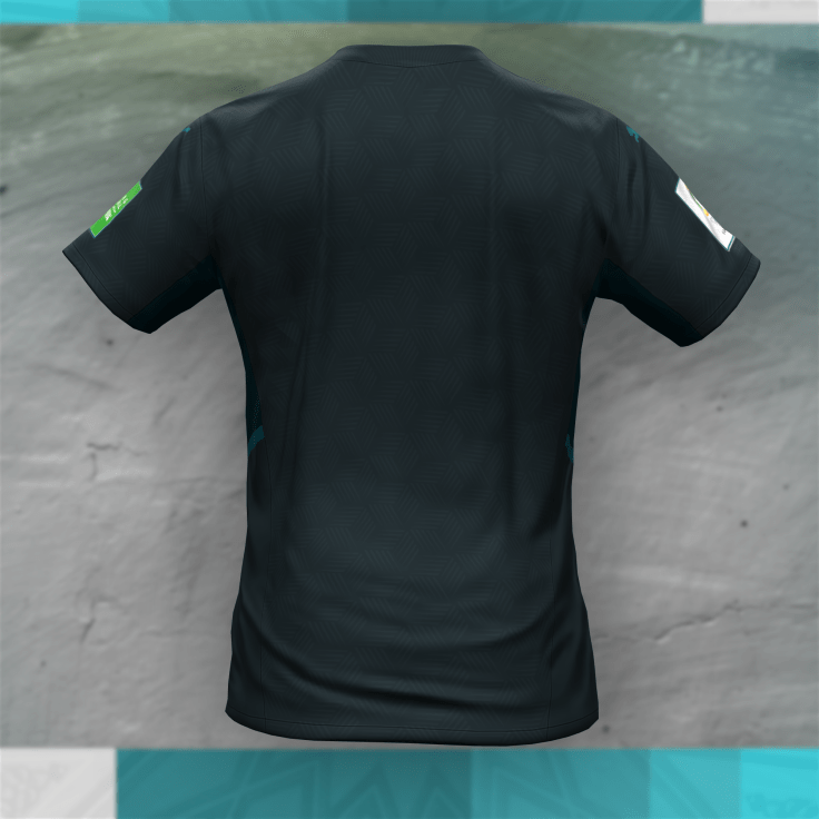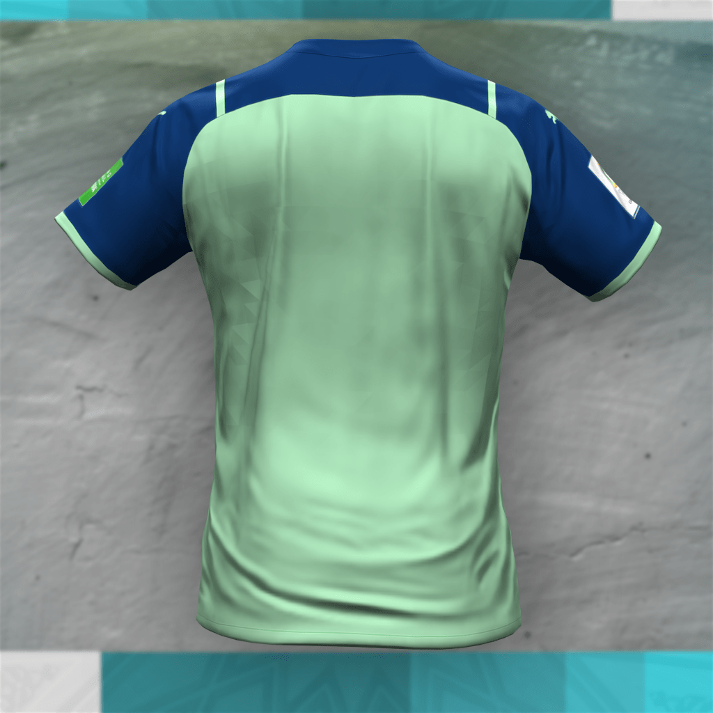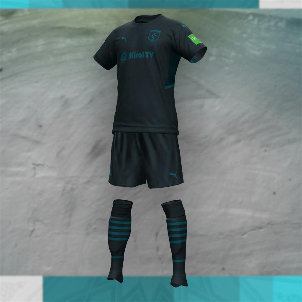 El uniforme alternativo o de visitante es bastante sencillo pero no menos elegante, aplicando el template que la marca del felino está usando en sus contratos esta temporada, en un muy oscuro verde botella donde también destaca el patrón de cubos, con un muy ad hoc cuello tipo henley. Todas las aplicaciones van en un tono más claro del verde base, incluyendo el escudo que en esta prenda va monocromático. Bajo las mangas se rompe el patrón en una malla de ventilación en el verde secundario.