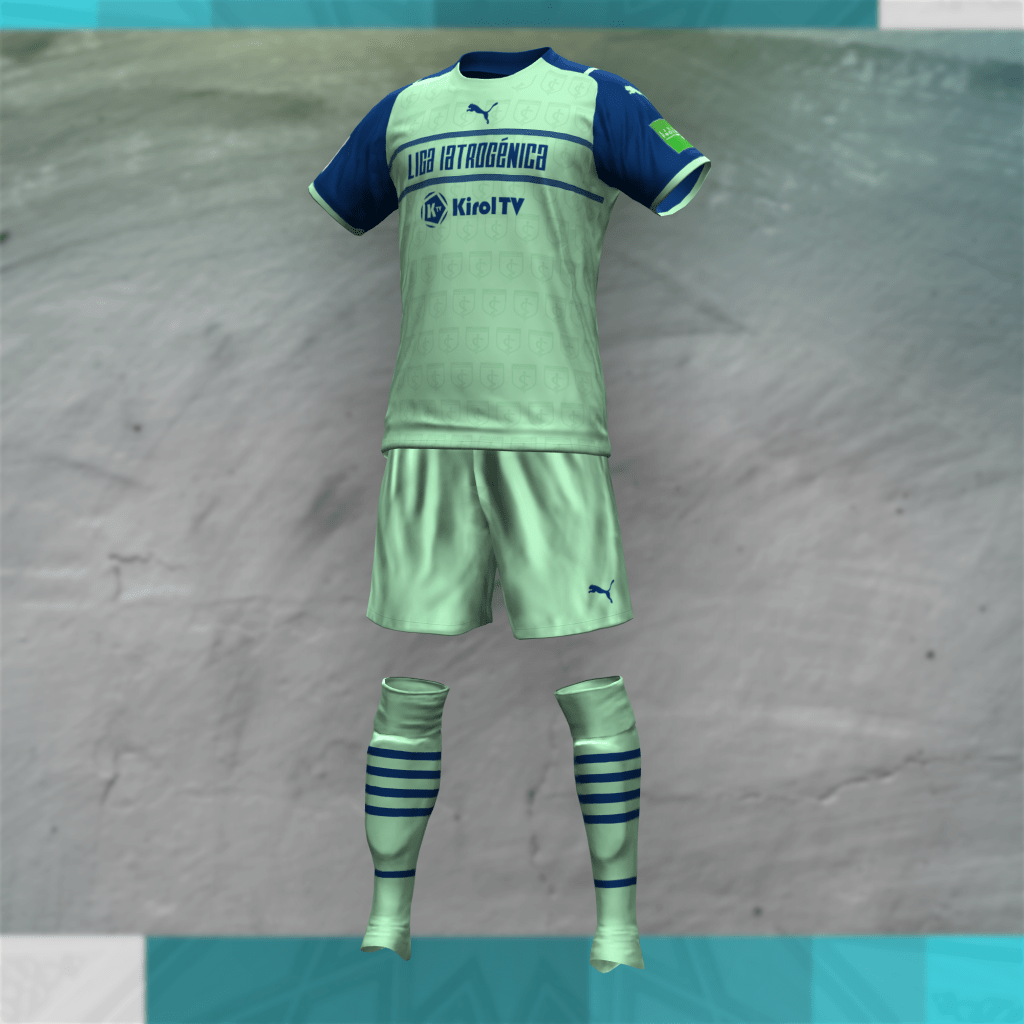 Para finalizar, los arqueros llevarán el patrón que ya vimos bastante en los modelos third para los equipos de la marca, en manga raglan con el panel horizontal en el pecho y el nombre del equipo en tipografía pesada. El cuerpo es de un verde lima muy tenue, con el escudo del Club en patrón de repetición en marca de agua, y un tono más claro del azul medianoche tiñe las mangas, el cuello y el panel superior de los hombros, así como las aplicaciones. El pantalón y las medias van en el color principal, repitiendo los aros de las medias de este modelo de catálogo.