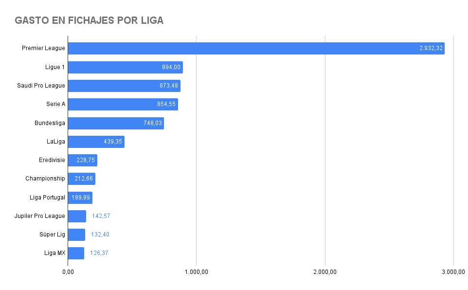 Situándose en el panorama mundial el torneo mexicano ocupa la 12ª posición en capital destinado a fichajes, un rubro donde no sorprende encontrar a la Liga Premier Inglesa en el primer escalón con sus 2.81 mil millones desembolsados. La Ligue 1 francesa se planta en un digno segundo sitio, mientras la emergente Saudi Pro League asalta el tercer sitio a punta de billetazos, que por ruidosa que haya sido, su inversión es casi 3.5 veces menor a la británica.