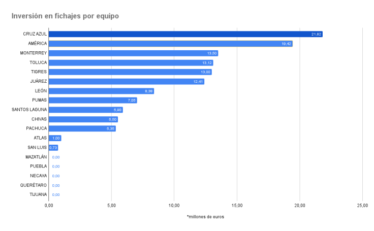 Cruz Azul es el club que más invirtió para este Apertura. La Máquina desembolsó el 17% del total de billetes de esta ventana de transferencias con 21.82 M€ repartidos entre sus 9 incorporaciones, siendo la más costosa la del extremo brasileño Moisés Vieira da Veiga procedente del Fortaleza de Ceará.