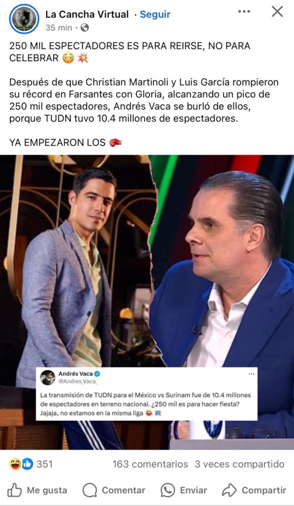 Esta semana, el debate lo encendió Andrés Vaca —sí, otra vez— al burlarse en redes de los 250 mil espectadores que Christian Martinoli y Luis García alcanzaron en una transmisión digital de la Copa Oro.